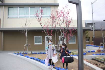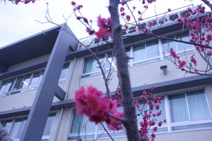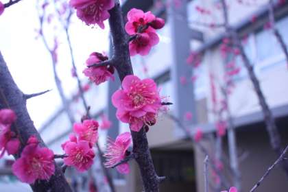 校庭に植えられている紅梅が美しい花を咲かせています。
