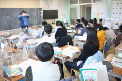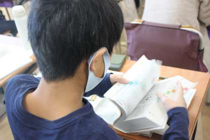 みんなで静かに読み、また国語辞典を使いながら言葉の意味を調べます。