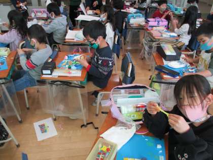 絵の具で色をつけて、思い思いのお弁当を作ります。