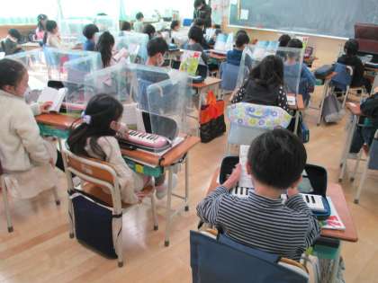 1年生が音楽で鍵盤ハーモニカの練習をしています。
