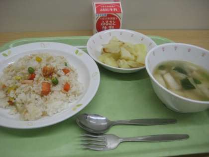 鮭ピラフ 焼きポテト かぶのスープ 牛乳