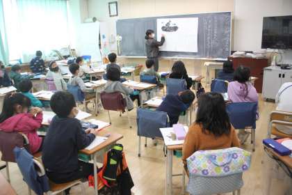 教科書に載っている説明文「どうぶつの赤ちゃん」を読みながら、筆者の伝えようとしていることを読み取る1年生。