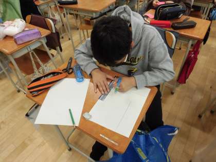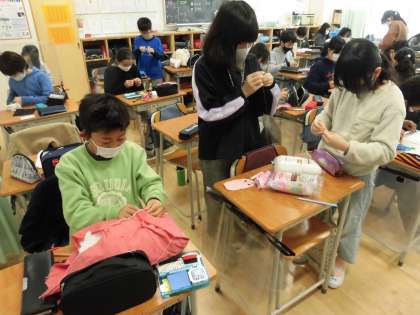 家庭科の時間では、手縫いで小物づくりをしています。設計図から自作し、思い思いの作品となるよう丁寧に縫い進めています。完成が楽しみです。