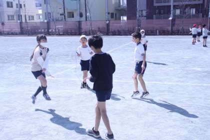 担任の先生がコートの準備をしている間、3年生たちは短なわとびをしながら待っています。