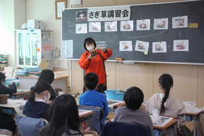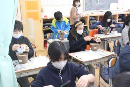 しっかりと説明を聞き、正しい手順で球根の植え付けを終えた5年生。