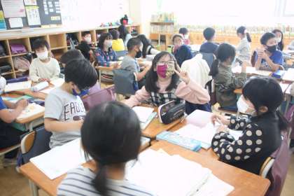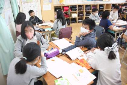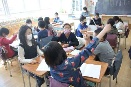 3年生が国語の学習で、若小の自慢できる点について話し合い活動をしています。