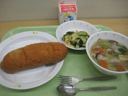 揚げパン わかめサラダ ワンタンスープ 牛乳