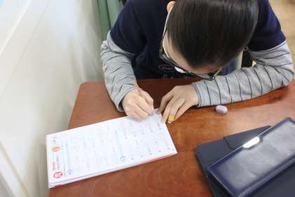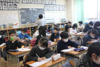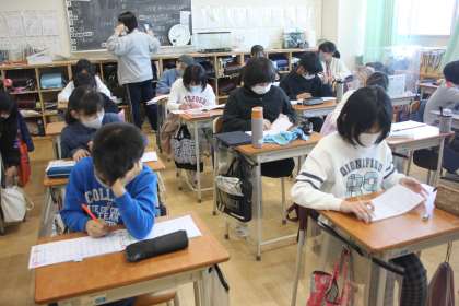 新出漢字は終わり、ドリルを使っておさらいに余念のない5年生たち。