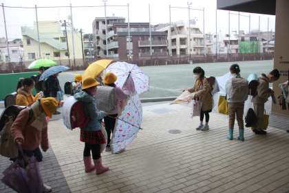 ピロティのところで傘をたたみながら、今日の目標を定める子どもたちでありました。