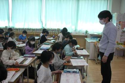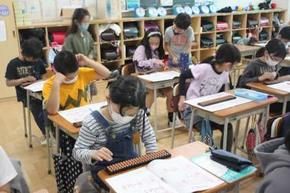 算数の先生が講師を務め、3年生の算数の時間にそろばん教室が開催されました。