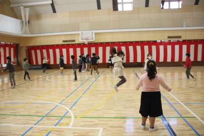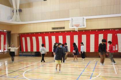 紅白幕が張られ、ボールが使えなかったので、みんなでなわとびをしています。