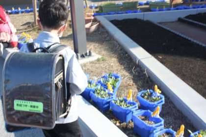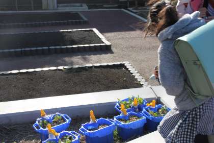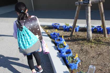 登校してきた2年生がまずチェックを入れるのが、植木鉢で育てている野菜たちです。