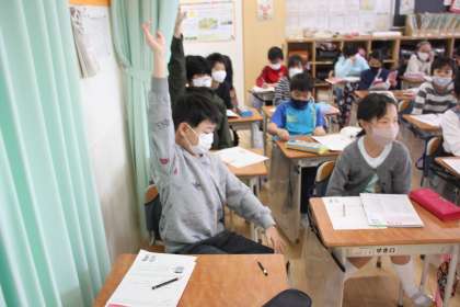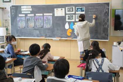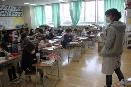 健康で清潔な生活の大切さを、資料と共に説明する先生。