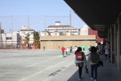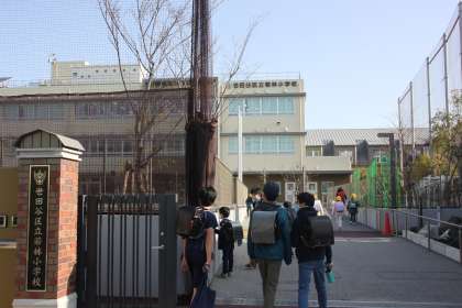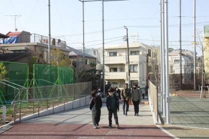 みんなで楽しくスタートを切るべく、あいさついっぱいの若小正門。