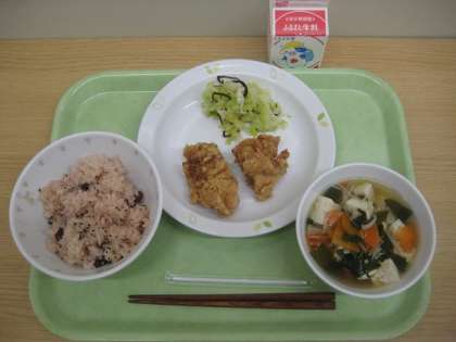 赤飯 鶏肉のから揚げ キャベツの塩昆布かけ すまし汁 牛乳