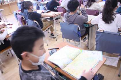 聴いている子たちは地図帳で、どこの場所かを確認します。