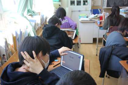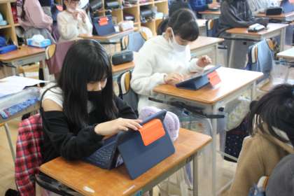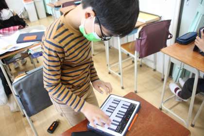 5年生がタブレットを使って、鼓笛の練習をしています。