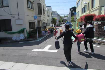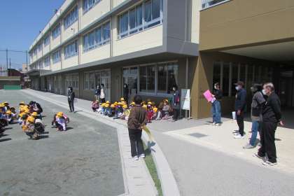 1年生はしばらく早めの下校となっています。色コース別に並んで帰ります。学童のお友達とはここでお別れです。慣れてきたら、自分で下校するようになっていきます。明日も元気に登校してきてください。