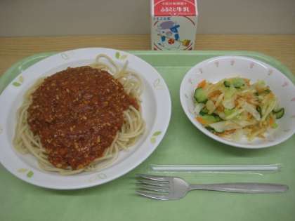 スパゲッティヘルシーミートソース じゃがいものハニーサラダ 牛乳