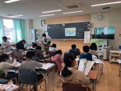 5年生の社会では、世界の国土について学習し始めました。いろんな視点から学習課題を見つけ、世界の大陸や日本の位置についての学びを深めていきます。
