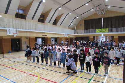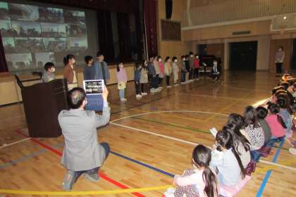 校庭で行う予定だった1年生を迎える会ですが、あいにくの天気だったので、会場を体育館に変更しました。1年生と6年生、児童会役員など限られた児童のみが体育館に集まり、各学年とはリモートでつなげて実施しました。予想以上にうまくいき、大成功です。代表児童の歓迎の言葉や1年生からのあいさつ、歌などを互いに交わしました。6年生は1年生のエスコート役として大活躍です。