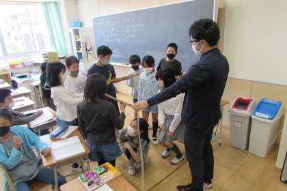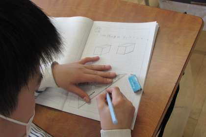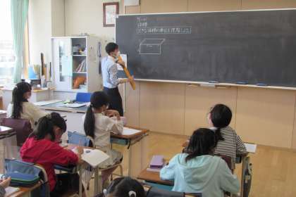 5年生の算数では、体積の学習を進めています。今日は形が大きなものの体積の表し方として、立法メールを学びました。1立方メートルの模型に入り、量感を養います。