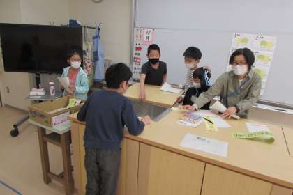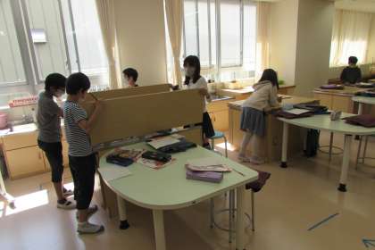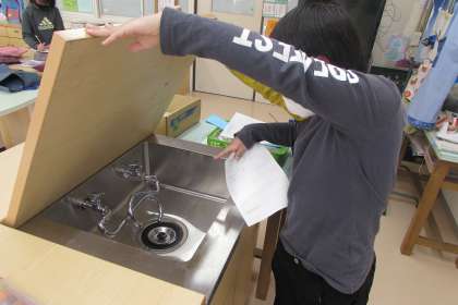 初めて家庭科室を使う5年生。まずは、家庭科室や準備室に何があるか、何が収納されているか、探検です。おっと!変わった形の蛇口を発見!