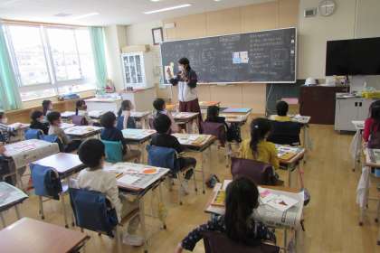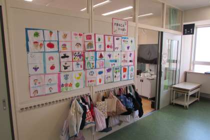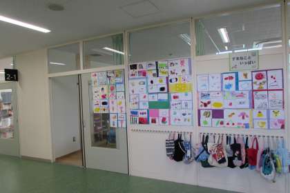 図工の時間に1年生が描いた絵が廊下に飾られています。好きな動物や食べ物のなど、きれいなで楽しい作品がいっぱいならんでいました。