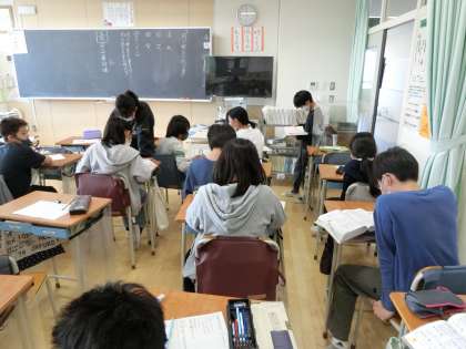 国語の授業では、同じ部分で同じ音をもつ漢字について学習しています。教科書以外にどんな漢字があるのか、みんな進んで辞書を引いて調べています。調べたい漢字もすぐに調べられる6年生。辞書の引き方もお手の物です。