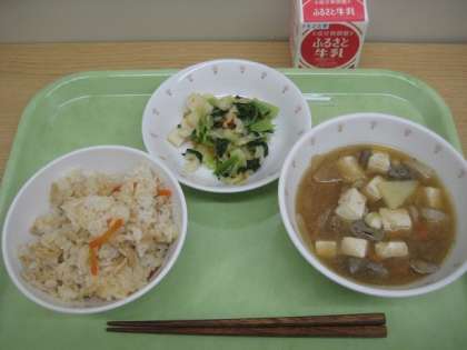 子ぎつねごはん かまぼこ入り和風サラダ 豚汁 牛乳