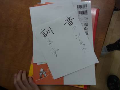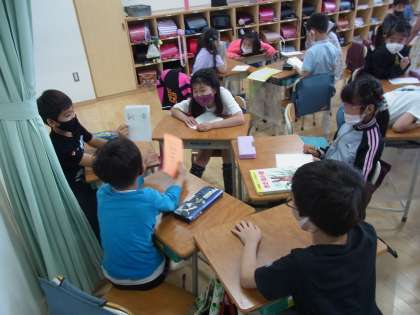 国語の学習で、音と訓の読み方をクイズで交流しました。辞典を使った学習とも関連していて、おもしろい漢字がたくさん出ました。辞典の使い方も上手になりました。