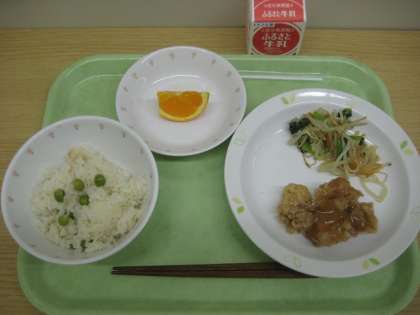 グリンピースごはん 鶏肉の梅みそかけ おひたし 清見タンゴール 牛乳