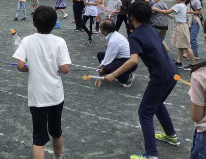 空気の力を使って水鉄砲やペットボトルロケットの実験を行いました。
