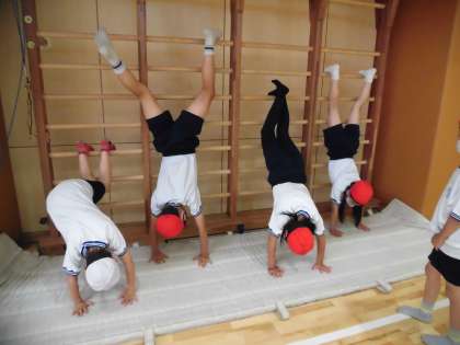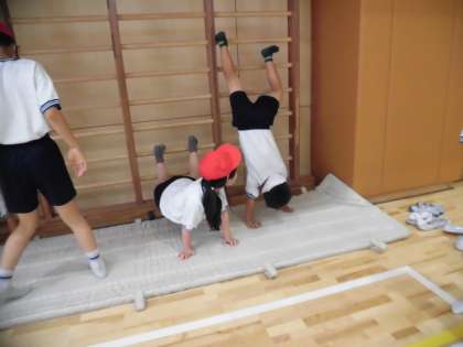 2年生では、マット遊びを楽しんでいます。鉛筆のように転がったり、ブリッジのまま歩いてみたりとマットの上で色々な動きに挑戦していました。そして、今日は、肋木(ろくぼく)に足をかけ、上にどんどん上がっていく動きにチャレンジしてみました。どの子どもたちも「きゃー!」や、「きついきつい!」と大興奮でした。体が逆さになる感覚は低学年のうちに身につけておきたいものです。ぜひ、お家でも壁などで(布団の上など安全に気を付けて)遊んでみてください。