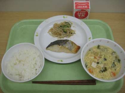 ごはん 鰆の西京焼き ごま酢かけ かきたま汁 牛乳