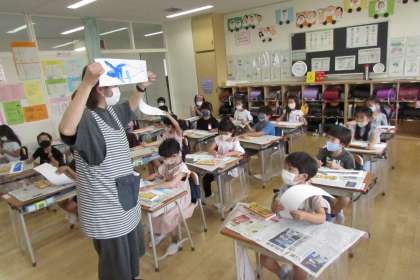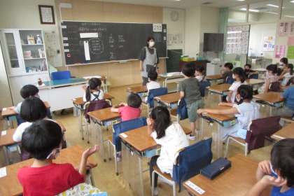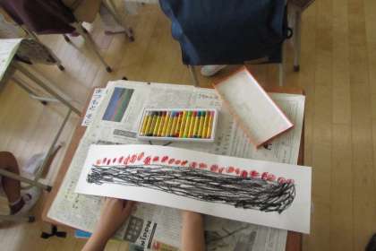 1年生の図工では、長い画用紙が配られ、何を描くと楽しいか、みんなで意見を出し合っていました。縦向き・横向きによっても、イメージできるものがかわってきます。クレヨンを走らせながら、みんな思い思いの作品を描いていました。