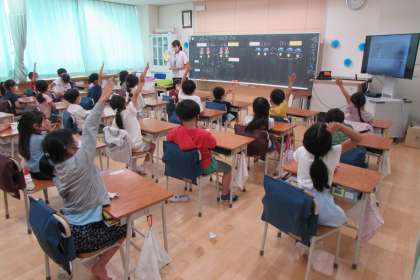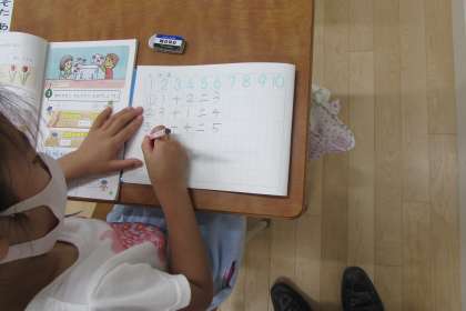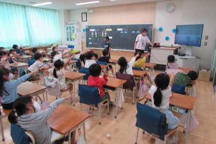 1年生のたし算の学習が進んできました。今日は、「ふえるといくつ?」の場面をいくつかとりあげ、図に表したり、式に表したりしました。ノートの使い方がうまくなってきましたね。