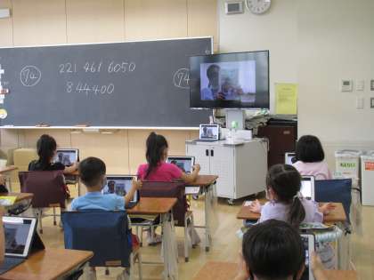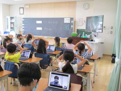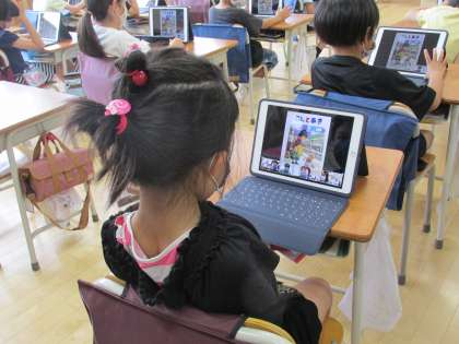 1年生は、初めてZOOMで,校長室とつながりました。画面に校長先生が大写しになって、子どもたちは大喜びでした。その後、「こんとあき」の絵本を読んでもらいました。