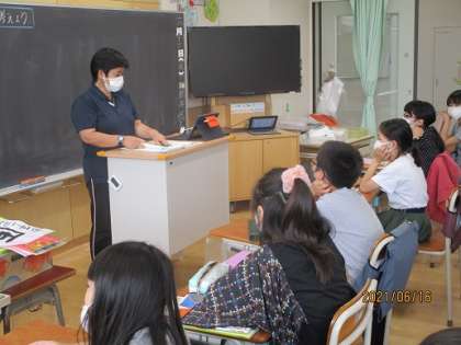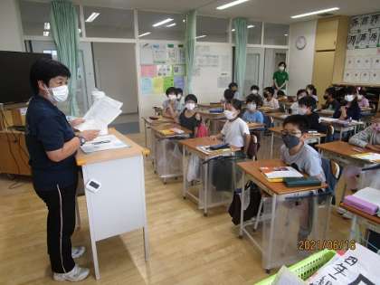 主事さんをゲストティーチャーにお招きして、学校で出るごみについてのお話をしていただきました。その中でも、給食の残菜についての話が子供たちには印象的だったようです。おいしい給食、大好きな給食!だけど、毎日たくさんの残菜が出ていることを知っておもわず「そんねに?!」「うそでしょ?!」の声が。