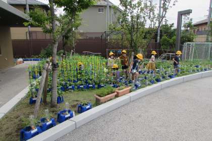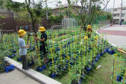 中休みの1年生は、アサガオの水やりタイム。一生懸命お世話に励んできたので、アサガオがだいぶ大きくなってきました。花が咲くのを心待ちにする1年生です。
