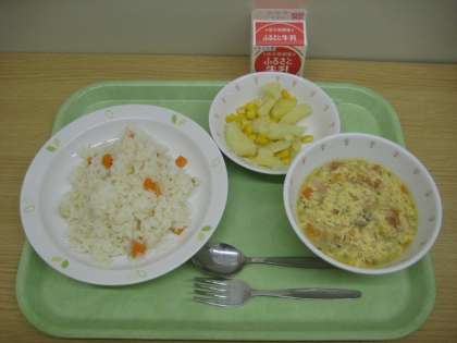 鮭ピラフ コーンポテト トマトと卵のスープ 牛乳