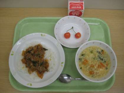 豚キムチ丼 中華風コーンスープ さくらんぼ 牛乳