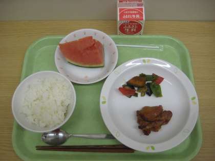 ごはん 鶏肉の照り焼き 夏野菜の南蛮かけ すいか 牛乳