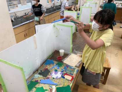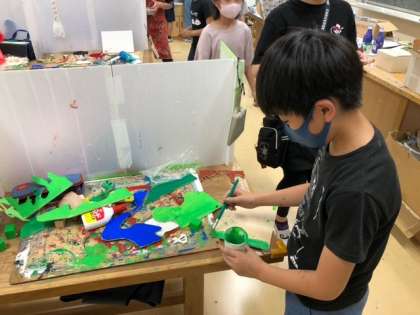 電動のこぎりで切った板を絵の具でぬり、組み立てる様子が見られます。そこで活躍している道具が、グルーガン!!扱い方に気をつけて、完成に向けてがんばります。