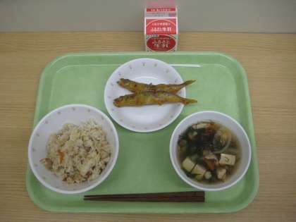 シシジューシー ししゃものカレー天ぷら もずくスープ 牛乳