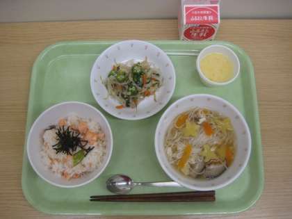 鮭ごはん オクラともやしのおひたし 七夕汁 ミルクゼリー 牛乳