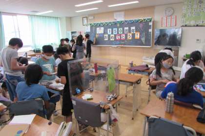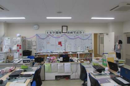 明日は150周年記念集会です。リモートによる集会のため、各教室をそれぞれ飾り付けています。もちろん職員室もです!給食では「祝」のナルトが・・・。
