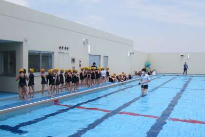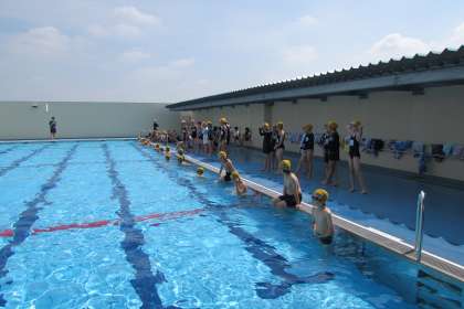 比較的に天気に恵まれた今日の日中、5年生と1年生が水泳学習に取り組んでいました。「最初は冷たかったけれと、大丈夫」と元気な子どもたち。1年生もだいぶ慣れてきましたね。