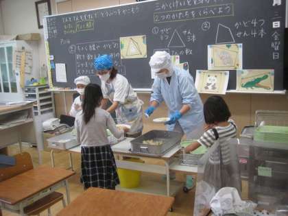 分散登校中の給食は教職員が中心となって配膳します。低学年のクラスには専科の先生やすまいるの先生、調理員さんが配膳のお手伝いに来てくれました。