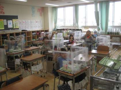 教室では人数は少ないけど、元気いっぱいに給食を食べる子供達の笑顔であふれていました。